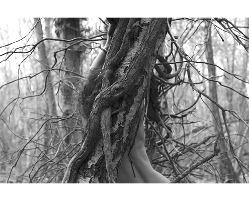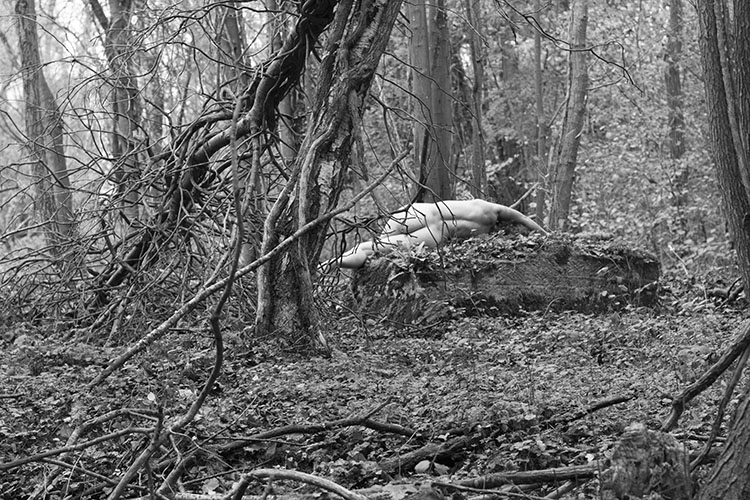 Ce projet est le prolongement du précédent (Di tanto in tanto 2016-2019) dans lequel je portais attention aux femmes en milieu agricole dans le sud tunisien et à leur relation au vivant. Aujourd’hui je photographie des femmes ou performe moi-même des rituels de passage qui trouvent une résonance particulière en forêt, un espace de liberté, d’immersion forte dans le monde végétal. Il peut y être question d’une forme d’oubli de Soi, d’ensauvagement et/ou de sacré. Ce projet propose un regard posé sur le corps de la femme et sur le vivant qui tente de n’être ni dominant, ni idéalisant. Ma nécessité artistique s’enracine dans la sensation de vivre dans une société qui tente de contrôler le vivant qui n’écoute plus ni son corps, ni la nature. Et cette réduction du corps à un être au monde très mentalisé voire virtualisé me semble former le terreau de l’inconscience écologique, de l’exploitation destructrice de la planète; d’un être relationnel aux êtres vivants, humains et non humains, fondé sur le contrôle et les dominations. Si elle nous coupe du vivant, notre volonté de contrôle nous renvoie également à notre peur de la mort, que l’éloignement au quotidien des cycles vie/mort/vie amplifie jusqu’à la terreur, le déni. Les rituels permettent à l’homme de traverser ces cycles im- muables de la vie. C’est certainement en Occident, qu’ils disparaissent le plus rapidement et perdent leur sens sans être remplacés. Faire connaître la forêt, donc possiblement l’aimer, par l’expérience, la sensation et une représentation artistique et non par le mental, ou une connaissance uniquement naturaliste. En effleurer la beauté vitale et fragile.